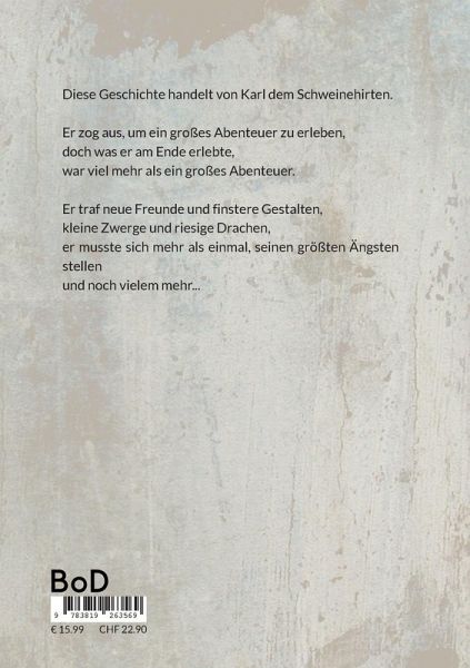 Diese Geschichte handelt von Karl dem Schweinehirten. Er zog aus, um ein großes Abenteuer zu erleben, doch was er am Ende erlebte, war viel mehr als ein großes Abenteuer. Er traf neue Freunde und finstere Gestalten, kleine Zwerge und riesige Drachen, er musste sich mehr als einmal, seinen größten Ängsten stellen und noch vielem mehr...