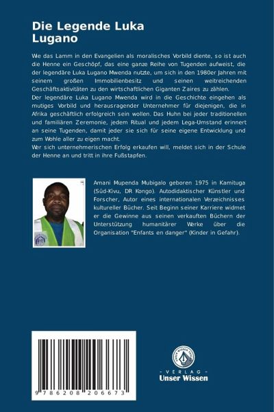 Wie das Lamm in den Evangelien als moralisches Vorbild diente, so ist auch die Henne ein Geschöpf, das eine ganze Reihe von Tugenden aufweist, die der legendäre Luka Lugano Mwenda nutzte, um sich in den 1980er Jahren mit seinem großen Immobilienbesitz und seinen weitreichenden Geschäftsaktivitäten zu den wirtschaftlichen Giganten Zaires zu zählen. Der legendäre Luka Lugano Mwenda wird in die Geschichte eingehen als mutiges Vorbild und herausragender Unternehmer für diejenigen, die in Afrika geschäftlich erfolgreich sein wollen. Das Huhn bei jeder traditionellen und familiären Zeremonie, jedem Ritual und jedem Lega-Umstand erinnert an seine Tugenden, damit jeder sie sich für seine eigene Entwicklung und zum Wohle aller zu eigen macht. Wer sich unternehmerischen Erfolg erkaufen will, meldet sich in der Schule der Henne an und tritt in ihre Fußstapfen.