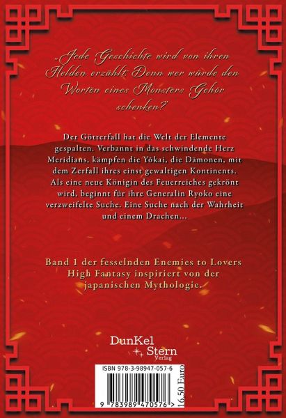 Die High Fantasy Sensation. Großartiges Worldbuilding trifft auf atemberaubende Plottwists und knisternde Tension. Das Leben einer Königin, gebunden an das Reich der Flammen. Die Seele einer Kriegerin, verdammt ein Geheimnis zu wahren, das Kontinente stürzen könnte. Das Herz eines Drachenprinzen, getrieben von dem Wunsch nach Vergeltung für die Seinen. Der Götterfall hat die Welt der Elemente gespalten. Verbannt in das schwindende Herz Meridîans, kämpfen die Y¿kai, die Dämonen, mit dem Zerfall ihres einst gewaltigen Kontinents. Als eine neue Königin des Feuerreiches gekrönt wird, beginnt für ihre Generalin Ryoko eine verzweifelte Suche. Eine Suche nach der Wahrheit und einem Drachen. Doch dafür muss sie tief in das Reich der Monster vordringen, die die Menschen so sehr fürchten. Monster, deren Seelen weit vollkommener und sanfter sind, als die junge Kriegerin ahnt.