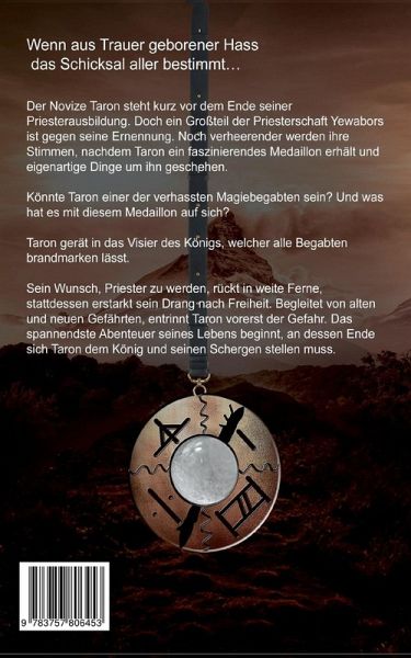 Wenn aus Trauer geborener Hass das Schicksal aller bestimmt... Der Novize Taron steht kurz vor dem Ende seiner Priesterausbildung. Doch ein Großteil der Priesterschaft Yewabors ist gegen seine Ernennung. Noch verheerender werden ihre Stimmen, nachdem Taron ein faszinierendes Medaillon erhält und eigenartige Dinge um ihn geschehen.Könnte Taron einer der verhassten Magiebegabten sein? Und was hat es mit diesem Medaillon auf sich?Taron gerät in das Visier des Königs, welcher alle Begabten brandmarken lässt.Sein Wunsch, Priester zu werden, rückt in weite Ferne, stattdessen erstarkt sein Drang nach Freiheit. Begleitet von alten und neuen Gefährten, entrinnt Taron vorerst der Gefahr. Das spannendste Abenteuer seines Lebens beginnt, an dessen Ende sich Taron dem König und seinen Schergen stellen muss.
