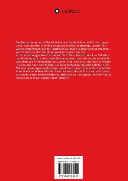 Die Studentin und Aushilfskellnerin Liane findet sich, ohne Erinnerung an die letzten Stunden in einer Sackgasse in Bochum abgelegt, wieder. Nur widerstrebend lässt sie den Gedanken zu, dass sie anscheinend ermordet wurde. Kurz vor der Obduktion wird ihr Körper aus dem Kriminalpathologischen Institut entführt. Die scheinbar sinnlose Tat stürzt den Polizeiapparat in hektische Betriebsamkeit, aber die Leiche wird nicht gefunden. Die Kriminalbeamten Luppert und Frauke stürzen sich verbissen in die Suche nach dem Mörder, der sie mehrfach auf falsche Fährten führt. Mit ihren ganz eigenen Methoden sucht auch die aufstrebende Journalistin Anne Greis nach dem Mörder. Sie ist es auch, die als Erste entdeckt, dass es sich um einen Serienmörder handelt. Soll sie den sympathischen Frauke einweihen oder auf eigene Faust handeln?