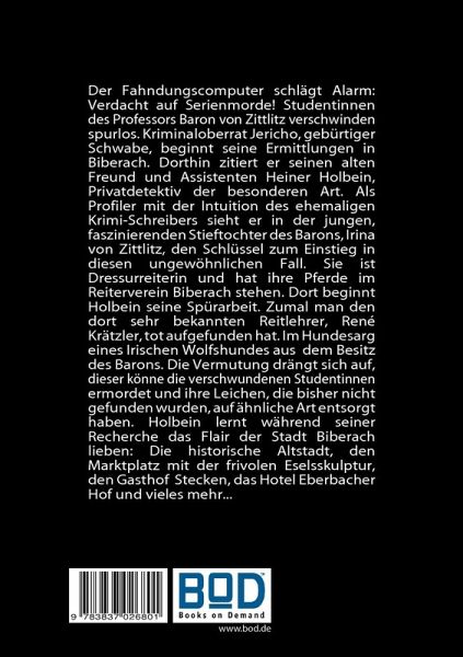 Der Fahndungscomputer schlägt Alarm: Verdacht auf Serienmorde! Studentinnen des Professors Baron von Zittlitz verschwinden spurlos. Kriminaloberrat Jericho, gebürtiger Schwabe, beginnt seine Ermittlungen in Biberach. Dorthin zitiert er seinen alten Freund und Assistenten Heiner Holbein, Privatdetektiv der besonderen Art. Als Profiler mit der Intuition des ehemaligen Krimi-Schreibers sieht er in der jungen, faszinierenden Stieftochter des Barons, Irina von Zittlitz, den Schlüssel zum Einstieg in diesen ungewöhnlichen Fall. Sie ist Dressurreiterin und hat ihre Pferde im Reiterverein Biberach stehen. Dort beginnt Holbein seine Spürarbeit. Zumal man den dort sehr bekannten Reitlehrer, René Krätzler, tot aufgefunden hat. Im Hundesarg eines Irischen Wolfshundes aus dem Besitz des Barons. Die Vermutung drängt sich auf, dieser könne die verschwundenen Studentinnen ermordet und ihre Leichen, die bisher nicht gefunden wurden, auf ähnliche Art entsorgt haben. Holbein lernt während seiner Recherche das Flair der Stadt Biberach lieben: Die historische Altstadt, den Marktplatz mit der frivolen Eselsskulptur, den Gasthof Stecken, das Hotel Eberbacher Hof und vieles mehr...