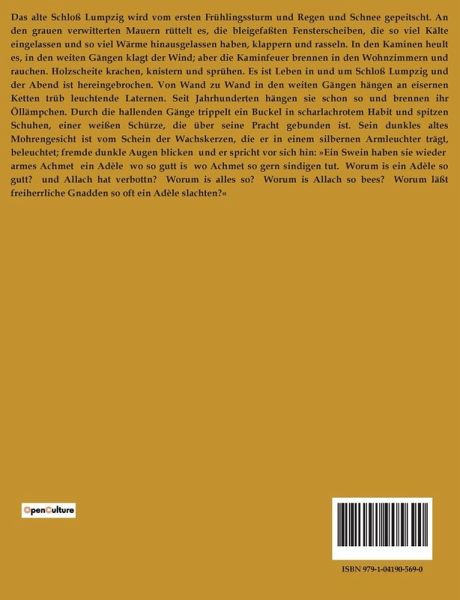 Das alte Schloß Lumpzig wird vom ersten Frühlingssturm und Regen und Schnee gepeitscht. An den grauen verwitterten Mauern rüttelt es, die bleigefaßten Fensterscheiben, die so viel Kälte eingelassen und so viel Wärme hinausgelassen haben, klappern und rasseln. In den Kaminen heult es, in den weiten Gängen klagt der Wind; aber die Kaminfeuer brennen in den Wohnzimmern und rauchen. Holzscheite krachen, knistern und sprühen. Es ist Leben in und um Schloß Lumpzig und der Abend ist hereingebrochen. Von Wand zu Wand in den weiten Gängen hängen an eisernen Ketten trüb leuchtende Laternen. Seit Jahrhunderten hängen sie schon so und brennen ihr Öllämpchen. Durch die hallenden Gänge trippelt ein Buckel in scharlachrotem Habit und spitzen Schuhen, einer weißen Schürze, die über seine Pracht gebunden ist. Sein dunkles altes Mohrengesicht ist vom Schein der Wachskerzen, die er in einem silbernen Armleuchter trägt, beleuchtet; fremde dunkle Augen blicken und er spricht vor sich hin: »Ein Swein haben sie wieder armes Achmet ein Adèle wo so gutt is wo Achmet so gern sindigen tut. Worum is ein Adèle so gutt? und Allach hat verbottn? Worum is alles so? Worum is Allach so bees? Worum läßt freiherrliche Gnadden so oft ein Adèle slachten?«
