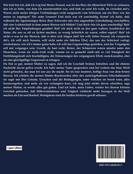 Wie froh bin ich, daß ich weg bin! Bester Freund, was ist das Herz des Menschen! Dich zu verlassen, den ich so liebe, von dem ich unzertrennlich war, und froh zu sein! Ich weiß, du verzeihst mir's. Waren nicht meine übrigen Verbindungen recht ausgesucht vom Schicksal, um ein Herz wie das meine zu ängstigen? Die arme Leonore! Und doch war ich unschuldig. Konnt' ich dafür, daß, während die eigensinnigen Reize ihrer Schwester mir eine angenehme Unterhaltung verschafften, daß eine Leidenschaft in dem armen Herzen sich bildete? Und doch--bin ich ganz unschuldig? Hab' ich nicht ihre Empfindungen genährt? Hab' ich mich nicht an den ganz wahren Ausdrücken der Natur, die uns so oft zu lachen machten, so wenig lächerlich sie waren, selbst ergetzt? Hab' ich nicht--o was ist der Mensch, daß er über sich klagen darf! Ich will, lieber Freund, ich verspreche dir's, ich will mich bessern, will nicht mehr ein bißchen Übel, das uns das Schicksal vorlegt, wiederkäuen, wie ich's immer getan habe; ich will das Gegenwärtige genießen, und das Vergangene soll mir vergangen sein. Gewiß, du hast recht, Bester, der Schmerzen wären minder unter den Menschen, wenn sie nicht--Gott weiß, warum sie so gemacht sind!--mit so viel Emsigkeit der Einbildungskraft sich beschäftigten, die Erinnerungen des vergangenen Übels zurückzurufen, eher als eine gleichgültige Gegenwart zu ertragen. Du bist so gut, meiner Mutter zu sagen, daß ich ihr Geschäft bestens betreiben und ihr ehstens Nachricht davon geben werde. Ich habe meine Tante gesprochen und bei weitem das böse Weib nicht gefunden, das man bei uns aus ihr macht. Sie ist eine muntere, heftige Frau von dem besten Herzen. Ich erklärte ihr meiner Mutter Beschwerden über den zurückgehaltenen Erbschaftsanteil; sie sagte mir ihre Gründe, Ursachen und die Bedingungen, unter welchen sie bereit wäre, alles herauszugeben, und mehr als wir verlangten--kurz, ich mag jetzt nichts davon schreiben, sage meiner Mutter, es werde alles gut gehen. Und ich habe, mein Lieber, wieder bei diesem kleinen Geschäft gefunden, daß Mißverständnisse und Trägheit vielleicht mehr Irrungen in der Welt machen als List und Bosheit. Wenigstens sind die beiden letzteren gewiß seltener.