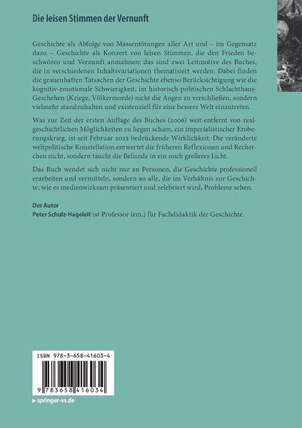 Geschichte als Abfolge von Massentötungen aller Art und - im Gegensatz dazu - Geschichte als Konzert von leisen Stimmen, die den Frieden beschwören und Vernunft anmahnen: das sind zwei Leitmotive des Buches, die in verschiedenen Inhaltsvariationen thematisiert werden. Dabei finden die grauenhaften Tatsachen der Geschichte ebenso Berücksichtigung wie die kognitiv-emotionale Schwierigkeit, im historisch-politischen Schlachthaus-Geschehen (Kriege, Völkermorde) nicht die Augen zu verschließen, sondern vielmehr standzuhalten und existenziell für eine bessere Welt einzutreten.