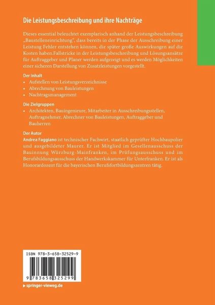 Dieses essential beleuchtet exemplarisch anhand der Leistungsbeschreibung "Baustelleneinrichtung", dass bereits in der Phase der Ausschreibung einer Leistung Fehler entstehen können, die später große Auswirkungen auf die Kosten haben.Fallstricke in der Leistungsbeschreibung und Lösungsansätze für Auftraggeber und Planer werden aufgezeigt und es werden Möglichkeiten einer sicheren Darstellung von Zusatzleistungen vorgestellt.