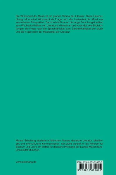 Die Wirkmacht der Musik ist ein großes Thema der Literatur. Diese Untersuchung reformuliert Wirkmacht als Frage nach der Lesbarkeit der Musik aus semiotischer Perspektive. Damit schließt sie an die lange Forschungstradition zum Wechselverhältnis von Literatur und Musik an und verbindet zwei Blickrichtungen: die Frage nach der Sprachfähigkeit bzw. Zeichenhaftigkeit der Musik und die Frage nach der Musikalität der Literatur.