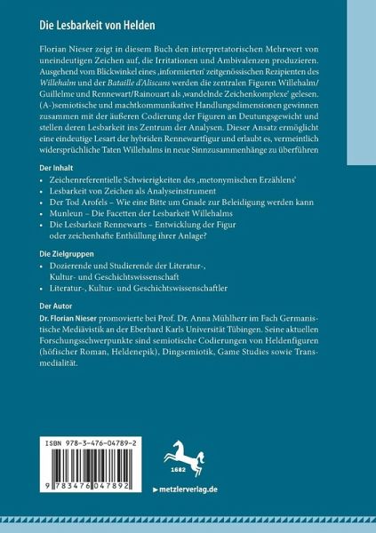 Florian Nieser zeigt in diesem Buch den interpretatorischen Mehrwert von uneindeutigen Zeichen auf, die Irritationen und Ambivalenzen produzieren. Ausgehend vom Blickwinkel eines 'informierten' zeitgenössischen Rezipienten des Willehalm und der Bataille d'Aliscans werden die zentralen Figuren Willehalm/Guillelme und Rennewart/Rainouart als 'wandelnde Zeichenkomplexe' gelesen. (A-)semiotische und machtkommunikative Handlungsdimensionen gewinnen zusammen mit der äußeren Codierung der Figuren an Deutungsgewicht und stellen deren Lesbarkeit ins Zentrum der Analysen. Dieser Ansatz ermöglicht eine eindeutige Lesart der hybriden Rennewartfigur und erlaubt es, vermeintlich widersprüchliche Taten Willehalms in neue Sinnzusammenhänge zu überführen.