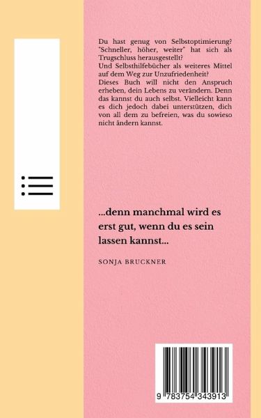 Du hast genug von Selbstoptimierung? "Schneller, höher, weiter" hat sich als Trugschluss herausgestellt? Und Selbsthilfebücher als weiteres Mittel auf dem Weg zur Unzufriedenheit?Dieses Buch will nicht den Anspruch erheben dein Lebens zu verändern. Denn das kannst du auch selbst. Vielleicht kann es dich jedoch dabei unterstützen, dich von all dem zu befreien, was du sowieso nicht ändern kannst. "Denn manchmal wird es erst gut, wenn du es sein lassen kannst." Sonja BrucknerInhalt:Einleitung1. LET IT BE 2. Gegen die To-do-Mentalität3. Wähle deine Kämpfe weise4. Sei dir selbst der beste Freund/die beste Freundin5. Was ist, darf sein, und was sein darf... .6. Ein jedes Nein ist ein Ja zu deinen eigenen Bedürfnissen7. Emotionen8. Über das Annehmen und Aushalten 9. Meine LET IT BE ListeQuellennachweisZur AutorinInkl. Links zu kostenlosen Downloads (Arbeitsblätter und Imaginationsreisen)