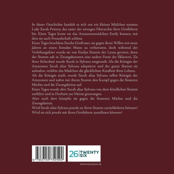 In dieser Geschichte handelt es sich um ein kleines Mädchen namens Lady Sarah Prisory, das unter der strengen Hierarchie ihrer Großeltern litt. Eines Tages lernte sie das Amazonenmädchen Emily kennen, mit dem sie auch Freundschaft schloss. Eines Tages beschloss Sarahs Großvater, sie gegen ihren Willen mit neun Jahren an einen fremden Mann zu verheiraten, doch während der Verlobungsfeier wurde sie von Emilys Stamm der Lynas gerettet, denn der Stamm sah in Zwangsheiraten eine andere Form der Sklaverei. Zu ihrer Sicherheit wurde Sarah in Sylvana umgetauft. Als die Königin der Amazonen Sarah alias Sylvana adoptierte und der ganze Stamm sie aufnahm, verlebte das Mädchen die glücklichste Kindheit ihres Lebens.Als die Königin starb, wurde Sarah alias Sylvana selbst Königin der Amazonen und nahm mit ihrem Stamm den Kampf gegen die finsteren Mächte und die Zwangsheirat auf.Eines Tages wurde aber Sarah alias Sylvana von dem feindlichen Stamm entführt und in Dorhain zur Heirat gezwungen.Aber auch dort kämpfte sie gegen die finsteren Mächte und die Zwangsheirat.Wird Sarah alias Sylvana jemals zu ihren Stamm zurückkehren können? Wird sie sich jemals mit ihren Großeltern aussöhnen können?