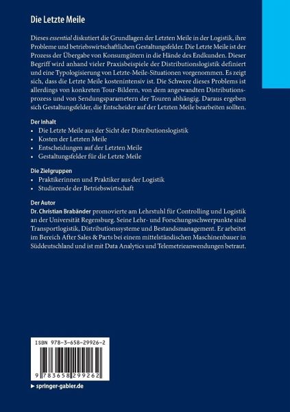 Dieses essential diskutiert die Grundlagen der Letzten Meile in der Logistik, ihre Probleme und betriebswirtschaftlichen Gestaltungsfelder. Die Letzte Meile ist der Prozess der Übergabe von Konsumgütern in die Hände des Endkunden. Dieser Begriff wird anhand vieler Praxisbeispiele der Distributionslogistik definiert und eine Typologisierung von Letzte-Meile-Situationen vorgenommen. Es zeigt sich, dass die Letzte Meile kostenintensiv ist. Die Schwere dieses Problems ist allerdings von konkreten Tour-Bildern, von dem angewandten Distributionsprozess und von Sendungsparametern der Touren abhängig. Daraus ergeben sich Gestaltungsfelder, die Entscheider auf der Letzten Meile bearbeiten sollten.