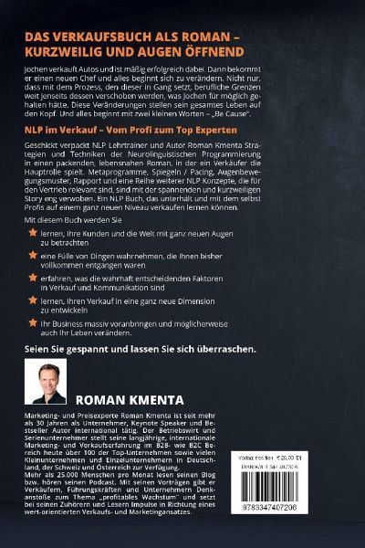 "Lehrreich wie ein Sachbuch, spannend wie ein Thriller"In diesem Businessroman tauchen Sie in das Leben des - bisher - mäßig erfolgreichen Autoverkäufers Jochen ein. Er bekommt einen neuen Chef und alles beginnt sich zu verändern. Dieser setzt einen Prozess in Gang, der Jochen weit über seine bisherigen Grenzen wachsen lässt. Dabei erleben Sie die Hoch- und Tiefpunkte des Protagonisten auf dem Weg zum erfolgreichen Verkäufer, die sein gesamtes Leben auf den Kopf stellen. Und alles beginnt mit zwei kleinen Worten: "Be Cause".Geschickt verpackt Autor und NLP Lehrtrainer Roman Kmenta Strategien und Techniken der Neurolinguistischen Programmierung in einen fesselnden, lebensnahen Roman, in der ein Verkäufer die Hauptrolle spielt. Die vielen effektiven NLP Techniken, die Ihnen helfen werden, noch erfolgreicher zu verkaufen, sind mit der spannenden und kurzweiligen Story eng verwoben.Ein Verkaufsbuch, das unterhält und mit dem selbst Verkaufsprofis auf einem ganz neuen Niveau verkaufen lernen können.