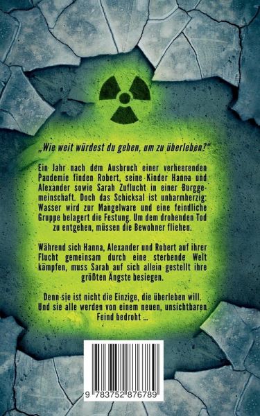 "Wie weit würdest du gehen, um zu überleben?"Ein Jahr nach dem Ausbruch einer verheerenden Pandemie finden Robert, seine Kinder Hanna und Alexander sowie Sarah Zuflucht in einer Burggemeinschaft. Doch das Schicksal ist unbarmherzig: Wasser wird zur Mangelware und eine feindliche Gruppe belagert die Festung. Um dem drohenden Tod zu entgehen, müssen die Bewohner fliehen.Während sich Hanna, Alexander und Robert auf ihrer Flucht gemeinsam durch eine sterbende Welt kämpfen, muss Sarah auf sich allein gestellt ihre größten Ängste besiegen.Denn sie ist nicht die Einzige, die überleben will.Und sie alle werden von einem neuen, unsichtbaren Feind bedroht ...