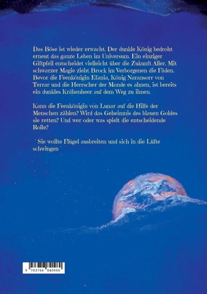 Das Böse ist wieder erwacht. Der dunkle König bedroht erneut das ganze Leben im Universum. Ein einziger Giftpfeil entscheidet vielleicht über die Zukunft Aller. Mit schwarzer Magie zieht Brock im Verborgenen die Fäden. Bevor die Feenkönigin Efania, König Naransorr von Terrar und die Herrscher der Monde es ahnen, ist bereits ein dunkles Krähenheer auf dem Weg zu ihnen.Kann die Feenkönigin von Lunar auf die Hilfe der Menschen zählen? Wird das Geheimnis des blauen Goldes sie retten? Und wer oder was spielt die entscheidende Rolle?`Sie wollte Flügel ausbreiten und sich in die Lüfte schwingen`