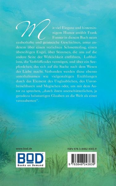 Mit viel Eleganz und hintersinnigem Humor erzählt Frank Forster in diesem Buch neun zauberhafte und geistreiche Geschichten, unter anderem über einen verliebten Schmetterling, einen übereifrigen Engel, über Stimmen, die uns auf die andere Seite der Wirklichkeit entführen, Luftballons, die Verblüffendes vermögen, und über ein Seepferdchen, das sich auf die Suche nach dem Wesen der Liebe macht. Verbunden werden diese ebenso unterhaltsamen wie vielgestaltigen Erzählungen durch das Element des Unglaublichen, des Unvorhersehbaren und Magischen oder, um mit dem Autor zu sprechen, "durch ihren unerschütterlichen, ja geradezu halsstarrigen Glauben an die Welt als einer verzauberten".