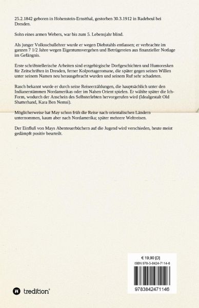 Karl May (1842-1912) war das fünfte von 14 Kindern einer armen Weberfamilie aus Ernstthal/Sachsen. Vom Studium am Lehrerseminar wurde er zunächst ausgeschlossen, nachdem er Kerzenreste unterschlagen hatte. Später konnte er die Ausbildung fortsetzen, arbeitete nur 14 Tage in seinem Beruf, bevor er wieder des Diebstahls bezichtigt und von der Liste der Kandidaten gestrichen wurde. Wegen Diebstahls, Betrugs und Hochstapelei wurde er in den Jahren darauf immer wieder verhaftet und monatelang festgesetzt. Die Jahre zwischen 1870 und 1874 verbrachte er im Zuchthaus Waldheim. Erst viele Jahre nach dem Erscheinen des akribisch recherchierten Orientzyklus reiste Karl May tatsächlich in den Orient. Karl May war lange Zeit einer der meistgelesenen deutschen Schriftsteller. Er starb1912 in Radebeul.