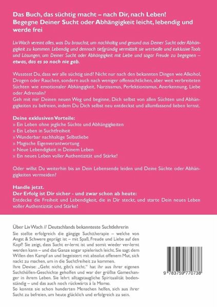 Das Buch, das süchtig macht: nach Dir, nach Leben! Begegne Deiner Sucht oder Abhängigkeit leicht, lebendig und werde frei. Liv Wach vereint alles, was Du brauchst, um nachhaltig und gesund aus Deiner Sucht oder Abhängigkeit zu kommen. Lebendig und dennoch tiefgründig vermittelt sie wertvolle und exklusive Tools und Lösungen, um Deiner Sucht oder Abhängigkeit mit Liebe und sogar Freude zu begegnen: etwas, das es so noch nie gab. Wusstest Du, dass wir alle süchtig sind? Nicht nur nach den bekannten Dingen wie Alkohol, Drogen oder Rauchen, sondern auch nach weniger offensichtlichen, aber weit verbreiteten Süchten wie emotionaler Abhängigkeit, Narzissmus, Perfektionismus, Anerkennung, Liebe oder Adrenalin? Geh mit mir den Weg rückwärts und beginne, Dich selbst von allen Süchten und Abhängigkeiten zu befreien, indem Du Dich selbst neu entdeckst und allumfassend lieben lernst. Deine exklusiven Vorteile: 1. Ein Leben ohne jegliche Süchte und Abhängigkeiten 2. Ein Leben in Suchtfreiheit 3. Wunderbar nachhaltige Selbstliebe 4. Magische Eigenverantwortung 5. Neue Lebendigkeit in Deinem Leben 6. Ein neues Leben voller Authentizität und Stärke! Oder willst Du weiterhin bis an Dein Lebensende leiden und Deine Süchte oder Abhängigkeiten vermeiden? Handle jetzt. Der Erfolg ist Dir sicher. Und zwar schon ab heute: Entdecke die Freiheit und Lebendigkeit, die in Dir steckt, und starte Dein neues Leben voller Authentizität und Stärke!