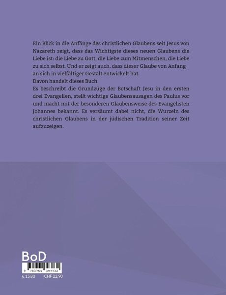 Ein Blick in die Anfänge des christlichen Glaubens seit Jesus von Nazareth zeigt, dass das Wichtigste dieses neuen Glaubens die Liebe ist: die Liebe zu Gott, die Liebe zum Mitmenschen, die Liebe zu sich selbst. Und er zeigt auch, dass dieser Glaube von Anfang an sich in vielfältiger Gestalt entwickelt hat.Davon handelt dieses Buch: Es beschreibt die Grundzüge der Botschaft Jesu in den ersten drei Evangelien, stellt wichtige Glaubensausagen des Paulus vor und macht mit der besonderen Glaubensweise des Evangelisten Johannes bekannt. Es versäumt dabei nicht, die Wurzeln des christlichen Glaubens in der jüdischen Tradition seiner Zeit aufzuzeigen.