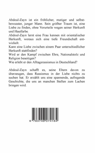 Abdoul-Zayn ist ein fröhlicher, mutiger und selbstbewusster, junger Mann, der oft von der Liebe träumt und an die wahre Liebe glaubt, ohne einen Unterschied zu machen zwischen der dunklen Hautfarbe und der hellen Hautfarbe.Es beginnt eine spannende und aufregende Geschichte.Wird Abdoul-Zayn seine große Liebe finden?Was hat Nationalität und Nationalstolz damit zu tun?Wie erlebt Abdoul-Zayn den Alltagsrassismus?Doch auch mit seiner dunklen Hautfarbe wird er den Kampf aufnehmen und seine Traumfrau finden. Abdoul-Zayn glaubt daran, dass die große Liebe stattfindet.