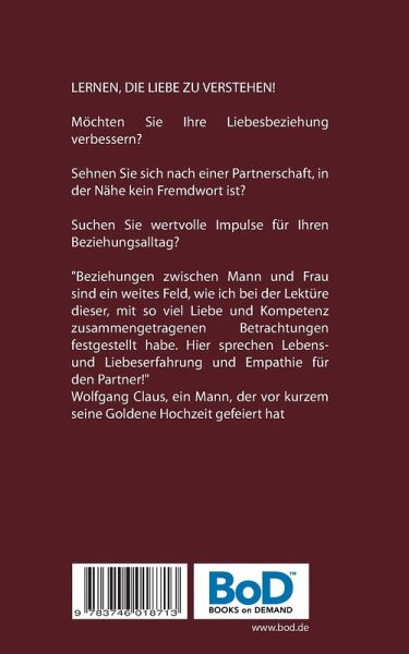 LERNEN, DIE LIEBE ZU VERSTEHEN!Möchten Sie Ihre Liebesbeziehung verbessern?Sehnen Sie sich nach einer Partnerschaft, in der Nähe kein Fremdwort ist?Suchen Sie wertvolle Impulse für Ihren Beziehungsalltag?"Beziehungen zwischen Mann und Frau sind ein weites Feld, wie ich bei der Lektüre dieser, mit so viel Liebe und Kompetenz zusammengetragenen Betrachtungen festgestellt habe. Hier sprechen Lebens- und Liebeserfahrung und Empathie für den Partner!" Wolfgang Claus, ein Mann, der vor kurzem seine Goldene Hochzeit gefeiert hat.