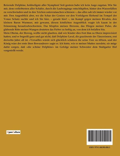 Reizende Delphine, holdseligste aller Nymphen! Seit gestern habe ich kein Auge zugetan. Wie Sie mir, dem verliebtesten aller Schäfer, durch die Laubengänge entschlüpften, hinter den Wasserfällen zu verschwinden und in den Teichen unterzutauchen schienen ¿, das alles sah ich immer wieder vor mir. Den Augenblick aber, wo die Schar der Genien vor den Verfolgern fliehend im Tempel der Venus Schutz suchte und ich Sie hier, ¿ gerade hier! ¿, im Kampf gegen meinen Rivalen, den kleinen Baron Wurmser, mir gewann, diesen köstlichen Augenblick wagte ich kaum in der Erinnerung heraufzubeschwören. Das Klopfen meines Herzens, das Fliegen meiner Pulse, die glühende Röte meiner Wangen deuteten das Fieber zu heftig an, von dem ich befallen bin. Mein Oheim, der Herzog, wollte nicht glauben, daß wir Kinder dies Fest ihm zu Ehren improvisiert hatten, und er begreift ganz und gar nicht, daß Delphine Laval, die graziöseste der Tänzerinnen, erst dreizehn Jahre alt ist. »Versailles würde sich glücklich schätzen ihr seine Tore zu öffnen, und der König wäre der erste ihrer Bewunderer« sagte er. Ich hörte, wie er meiner Mutter zuredete, sie möge dafür sorgen, daß »die schöne Delphine« im Gefolge meiner Schwester dem Stuttgarter Hof vorgestellt werde.