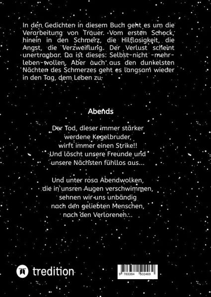 In diesem Buch geht es um die Verarbeitung von Trauer. Vom ersten Schock, hinein in den Schmerz, die Hilflosigkeit, die Angst, die Verzweiflung. Der Verlust scheint unertragbar. Da ist dieses: Selbst-nicht -mehr-leben-wollen. Anfangs glaubt man den Schmerz nicht aushalten zu können. Die Trauer frisst die Seele auf. Aber auch aus den dunkelsten Nächten des Schmerzes geht es langsam wieder in den Tag, dem Leben zu.