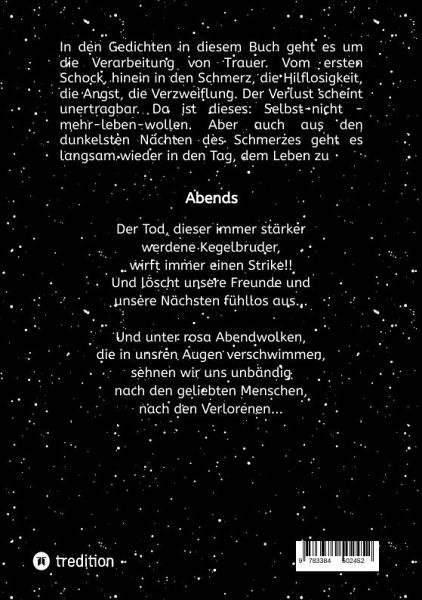In diesem Buch geht es um die Verarbeitung von Trauer. Vom ersten Schock, hinein in den Schmerz, die Hilflosigkeit, die Angst, die Verzweiflung. Der Verlust scheint unertragbar. Da ist dieses: Selbst-nicht -mehr-leben-wollen. Anfangs glaubt man den Schmerz nicht aushalten zu können. Die Trauer frisst die Seele auf. Aber auch aus den dunkelsten Nächten des Schmerzes geht es langsam wieder in den Tag, dem Leben zu.