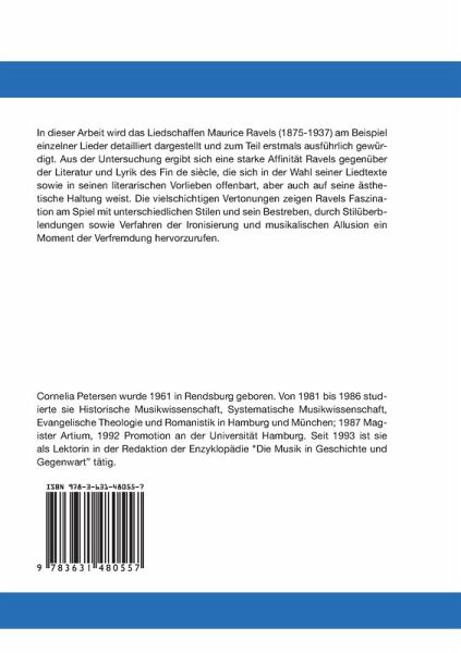 In dieser Arbeit wird das Liedschaffen Maurice Ravels (1875-1937) am Beispiel einzelner Lieder detailliert dargestellt und zum Teil erstmals ausführlich gewürdigt. Aus der Untersuchung ergibt sich eine starke Affinität Ravels gegenüber der Literatur und Lyrik des Fin de siècle, die sich in der Wahl seiner Liedtexte sowie in seinen literarischen Vorlieben offenbart, aber auch auf seine ästhetische Haltung weist. Die vielschichtigen Vertonungen zeigen Ravels Faszination am Spiel mit unterschiedlichen Stilen und sein Bestreben, durch Stilüberblendungen sowie Verfahren der Ironisierung und musikalischen Allusion ein Moment der Verfremdung hervorzurufen.