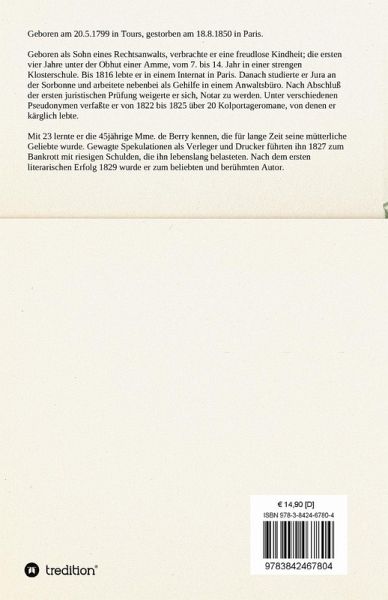 Honoré de Balzac (1799-1850): Der französische Schriftsteller gilt als Begründer des soziologischen Realismus. Mit seinem Hauptwerk, dem unvollendeten Zyklus 'La Comédie Humaine' versucht er in über 80 Bänden, die Gesellschaft seiner Zeit darzustellen. Balzac, am 20. Mai 1799 in Tours als Sohn eines Rechtsanwalts geboren, wandte sich allerdings erst nach dem Abbruch seines Jura-Studiums an der Pariser Sorbonne der Literatur zu. Zunächst verfasste er jedoch wenig erfolgreich unter verschiedenen Pseudonymen Romane. Ebenso scheiterte er als Verleger, mit seiner Druckerei ging er Bankrott. Erst sein historischer Roman 'La dernier Chouan' bringt 1829 den Durchbruch. Fünf Monate vor seinem Tod am 18. August 1850 heiratet Balzac Eveline Hanska, mit der er bereits viele Jahre Briefkontakt pflegte.