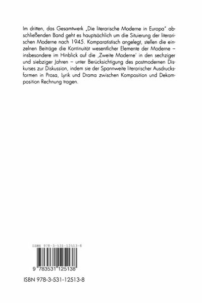 Im dritten, das Gesamtwerk "Die literarische Moderne in Europa" abschließenden Band geht es hauptsächlich um die Situierung der literarischen Moderne nach 1945. Komparatistisch angelegt, stellen die einzelnen Beiträge die Kontinuität wesentlicher Elemente der Moderne - insbesondere im Hinblick auf die 'Zweite Moderne' in den sechziger und siebziger Jahren - unter Berücksichtigung des postmodernen Diskurses zur Diskussion, indem sie der Spannbreite literarischer Ausdrucksformen in Prosa, Lyrik und Drama zwischen Komposition und Dekomposition Rechnung tragen.