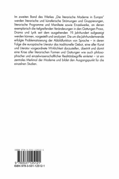 Im zweiten Band des Werkes "Die literarische Moderne in Europa" werden literarische und künstlerische Strömungen und Gruppierungen, literarische Programme und Manifeste sowie Einzelwerke, an denen exemplarisch die tiefgreifenden Veränderungen in den Gattungen Prosa, Drama und Lyrik seit dem ausgehenden 19. Jahrhundert aufgezeigt werden können, vorgestellt und analysiert. Die um die Jahrhundertwende erfolgte Problematisierung der Abbildfunktion von Sprache - in deren Folge die europäische Literatur das traditionelle Gebot, eine aller Kunst und Literatur vorgeordnete Wirklichkeit darzustellen, übertritt und damit eine Krise aller literarischen Formen und Gattungen wie auch philosophischer und einzelwissenschaftlicher Realitätsbegriffe einleitet - ist ein zentrales Merkmal der Moderne und bildet den Ausgangspunkt für die einzelnen Studien.