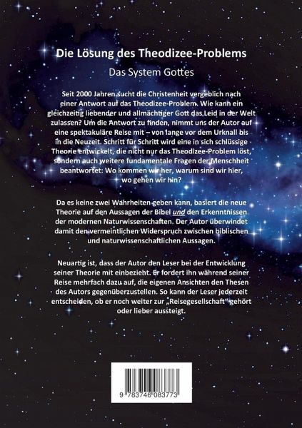 Seit 2000 Jahren sucht die Christenheit vergeblich nach einer Antwort auf das Theodizee-Problem. Wie kann ein gleichzeitig liebender und allmächtiger Gott das Leid in der Welt zulassen?Um die Antwort zu finden, nimmt uns der Autor auf eine spektakuläre Reise von lange vor dem Urknall bis in die Neuzeit mit. Schritt für Schritt wird eine in sich schlüssige Theorie entwickelt, die nicht nur das Theodizee-Problem löst, sondern auch weitere fundamentale Fragen der Menschheit, wo kommen wir her, warum sind wir hier, wo gehen wir hin, beantwortet.Da es keine zwei Wahrheiten geben kann, basiert die neue Theorie auf den Aussagen der Bibel und den Erkenntnissen der modernen Naturwissenschaften. Der Autor überwindet damit den vermeintlichen Widerspruch zwischen biblischen und naturwissenschaftlichen Aussagen.Neuartig ist, dass der Autor den Leser bei der Entwicklung seiner Theorie mit einbezieht. Er fordert ihn während seiner Reise mehrfach dazu auf, die eigenen Ansichten den Thesen des Autors gegenüberzustellen. So kann der Leser jederzeit entscheiden, ob er noch weiter zur "Reisegesellschaft" gehört oder lieber aussteigt.