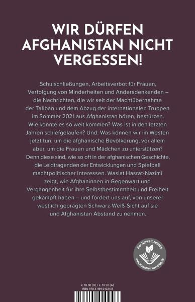Sowohl anhand von Gesprächen, die sie mit Afghaninnen hier und vor Ort geführt hat, als auch mithilfe ihrer eigenen Familiengeschichte gibt Waslat Hasrat-Nazimi einen Einblick in den Kampf afghanischer Frauen gegen die systematische Unterdrückung. Sie erzählt von ihren Hoffnungen und Ängsten, von Mut, Verzweiflung und Stärke. Ein bewegendes, kämpferisches und aufklärerisches Buch - und eine emanzipierte Perspektive auf die Frauen Afghanistans.