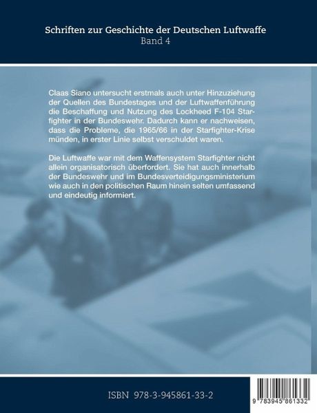 Claas Siano untersucht erstmals auch unter Hinzuziehung der Quellen des Bundestages und der Luftwaffenführung die Beschaffung und Nutzung des Lockheed F-104 Starfighters in der Bundeswehr. Dadurch kann er nachweisen, dass die Probleme, die 1965/66 in der Starfighter-Krise mündeten, in erster Linie selbst verschuldet waren. Die Luftwaffe war mit dem Waffensystem Starfighter nicht allein organisatorisch überfordert. Sie hat auch innerhalb der Bundeswehr und im Bundesverteidigungsministerium, wie auch in den politischen Raum hinein selten umfassend und eindeutig informiert.