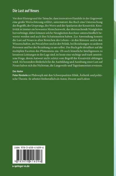 Vor dem Hintergrund der Tatsache, dass innovatives Handeln in der Gegenwart eine große Wertschätzung erfährt, unternimmt das Buch eine Untersuchung des Begriffs, des Ursprungs, des Werts und der Spielarten der Kreativität. Kreativität ist immer ein bewusstes Menschenwerk, das überraschende Neuigkeiten hervorbringt; dabei können solche Neuigkeiten durchaus unterschiedlich bewertet werden und auch ihre Schattenseiten haben. Zur Anwendung kommt die Lust auf Neues in allen Bereichen des Lebens - in den Künsten und in den Wissenschaften, im Privatleben und in der Politik, bei Beziehungen zu anderen Personen und bei der Beziehung zu uns selbst. Das Buch geht detailliert auf die multiplen Facetten des Phänomens ein. Ob auch künstliche Intelligenzen zu kreativen Leistungen in der Lage sind, ist heute eine wichtige und stark umstrittene Frage, deren Antwort nicht zuletzt vom Begriff der Kreativität abhängen wird. Als besonders förderlich für die Ausbildung und Ausübung einer Lust auf Neues haben sich das Nichtstun, die Langeweile und Tagträumereien erwiesen.