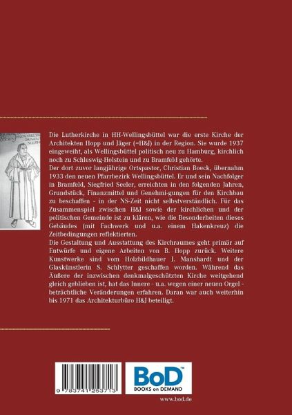 Die Lutherkirche in HH-Wellingsbüttel war die erste Kirche der Architekten Hopp und Jäger (=H&J) in der Region. Sie wurde 1937 eingeweiht, als Wellingsbüttel politisch neu zu Hamburg, kirchlich noch zu Schleswig-Holstein und zu Bramfeld gehörte.Der dort zuvor langjährige Ortspastor, Christian Boeck, übernahm 1933 den neuen Pfarrbezirk Wellingsbüttel. Er und sein Nachfolger in Bramfeld, Siegfried Seeler, erreichten in den folgenden Jahren, Grundstück, Finanzmittel und Genehmigungen für den Kirchbau zu beschaffen - in der NS-Zeit nicht selbstverständlich. Für das Zusammenspiel zwischen H&J sowie der kirchlichen und der politischen Gemeinde ist zu klären, wie die Besonderheiten dieses Gebäudes (eines der Dekor-Elemente im Fachwerk war ein Hakenkreuz) die Zeitbedingungen reflektierten.Die Gestaltung und Ausstattung des Kirchraumes geht primär auf Entwürfe und eigene Arbeiten von B. Hopp zurück. Weitere Kunstwerke sind vom Holzbildhauer J. Manshardt und der Glaskünstlerin S. Schlyttergeschaffen worden. Während das Äußere der inzwischen denkmalgeschützten Kirche weitgehend gleich geblieben ist, hat das Innere - u.a. wegen einer neuen Orgel - beträchtliche Veränderungen erfahren. Daran war auch weiterhin bis 1971 das Architekturbüro H&J beteiligt.