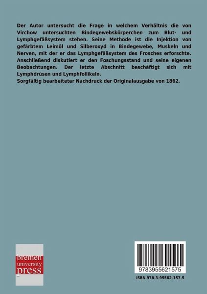 Der Autor untersucht die Frage in welchem Verhältnis die von Virchow untersuchten Bindegewebskörperchen zum Blut- und Lymphgefäßsystem stehen. Seine Methode ist die Injektion von gefärbtem Leimöl und Silberoxyd in Bindegewebe, Muskeln und Nerven, mit der er das Lymphgefäßsystem des Frosches erforschte. Anschließend diskutiert er den Foschungsstand und seine eigenen Beobachtungen. Der letzte Abschnitt beschäftigt sich mit Lymphdrüsen und Lymphfollikeln.