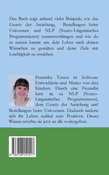 Das Buch zeigt anhand vieler Beispiele, wie das Gesetz der Anziehung, Bestellungen beim Universum und NLP (Neuro-Linguistisches Programmieren) zusammenhängen und wie du es nutzen kannst um dein Leben nach deinen Wünschen zu gestalten und deine Ziele mit Leichtigkeit zu erreichen.