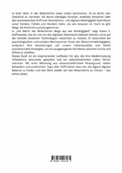 In einer Welt, in der Bildschirme unser Leben dominieren, ist es leicht, den Überblick zu verlieren. Ob durch ständiges Scrollen, endloses Streamen oder den automatischen Griff zum Smartphone - die digitale Abhängigkeit beeinflusst unser Denken, Fühlen und Handeln mehr, als uns bewusst ist. Doch es gibt Wege, die Kontrolle zurückzugewinnen.In "Die Macht der Bildschirme: Wege aus der Abhängigkeit" zeigt Anton S. Hoffmeister, wie wir uns von der digitalen Übermacht befreien können, ohne auf die Vorteile moderner Technologien verzichten zu müssen. Er beleuchtet die psychologischen und sozialen Mechanismen hinter der Bildschirmabhängigkeit, analysiert ihre Auswirkungen auf unsere Lebensqualität und bietet praxiserprobte Strategien, um ein ausgewogenes Verhältnis zwischen online und offline zu schaffen.Dieses Buch ist ein inspirierender Leitfaden für alle, die ihre Mediennutzung reflektieren, bewusster gestalten und ein selbstbestimmtes Leben führen möchten. Mit einer Mischung aus wissenschaftlichem Hintergrund, realen Beispielen und praktischen Tipps lädt Hoffmeister dazu ein, die eigene digitale Balance zu finden und den Blick wieder auf das Wesentliche zu richten - das echte Leben.