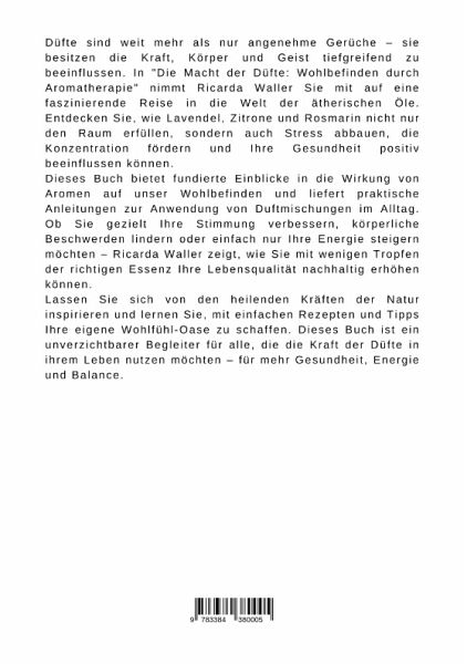 Düfte sind weit mehr als nur angenehme Gerüche - sie besitzen die Kraft, Körper und Geist tiefgreifend zu beeinflussen. In "Die Macht der Düfte: Wohlbefinden durch Aromatherapie" nimmt Ricarda Waller Sie mit auf eine faszinierende Reise in die Welt der ätherischen Öle. Entdecken Sie, wie Lavendel, Zitrone und Rosmarin nicht nur den Raum erfüllen, sondern auch Stress abbauen, die Konzentration fördern und Ihre Gesundheit positiv beeinflussen können.Dieses Buch bietet fundierte Einblicke in die Wirkung von Aromen auf unser Wohlbefinden und liefert praktische Anleitungen zur Anwendung von Duftmischungen im Alltag. Ob Sie gezielt Ihre Stimmung verbessern, körperliche Beschwerden lindern oder einfach nur Ihre Energie steigern möchten - Ricarda Waller zeigt, wie Sie mit wenigen Tropfen der richtigen Essenz Ihre Lebensqualität nachhaltig erhöhen können.Lassen Sie sich von den heilenden Kräften der Natur inspirieren und lernen Sie, mit einfachen Rezepten und Tipps Ihre eigene Wohlfühl-Oase zu schaffen. Dieses Buch ist ein unverzichtbarer Begleiter für alle, die die Kraft der Düfte in ihrem Leben nutzen möchten - für mehr Gesundheit, Energie und Balance.
