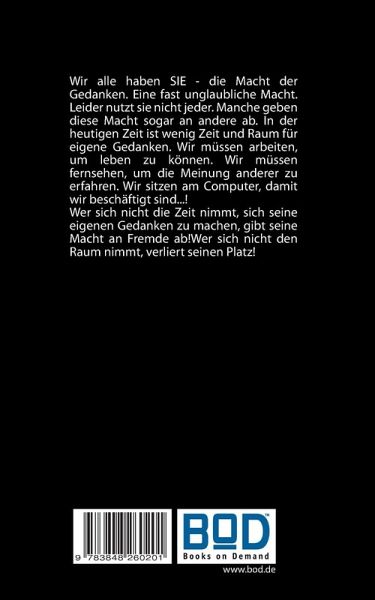 Wir alle haben SIE - die Macht der Gedanken. Eine fast unglaubliche Macht. Leider nutzt sie nicht jeder. Manche geben diese Macht sogar an andere ab. In der heutigen Zeit ist wenig Zeit und Raum für eigene Gedanken. Wir müssen arbeiten, um leben zu können. Wir müssen fernsehen, um die Meinung anderer zu erfahren. Wir sitzen am Computer, damit wir beschäftigt sind...! Wer sich nicht die Zeit nimmt, sich seine eigenen Gedanken zu machen, gibt seine Macht an Fremde ab!Wer sich nicht den Raum nimmt, verliert seinen Platz!
