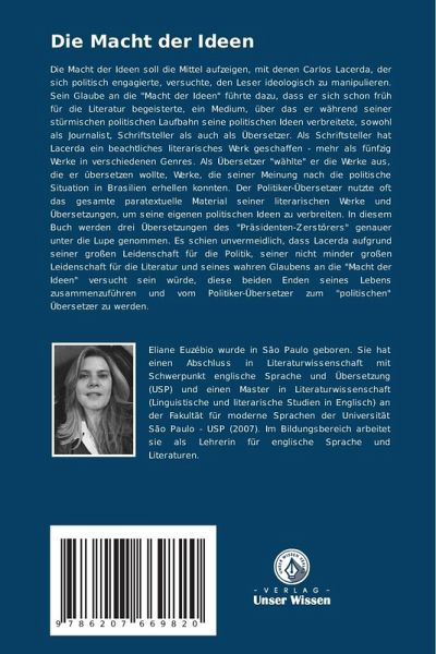 Die Macht der Ideen soll die Mittel aufzeigen, mit denen Carlos Lacerda, der sich politisch engagierte, versuchte, den Leser ideologisch zu manipulieren. Sein Glaube an die "Macht der Ideen" führte dazu, dass er sich schon früh für die Literatur begeisterte, ein Medium, über das er während seiner stürmischen politischen Laufbahn seine politischen Ideen verbreitete, sowohl als Journalist, Schriftsteller als auch als Übersetzer. Als Schriftsteller hat Lacerda ein beachtliches literarisches Werk geschaffen - mehr als fünfzig Werke in verschiedenen Genres. Als Übersetzer "wählte" er die Werke aus, die er übersetzen wollte, Werke, die seiner Meinung nach die politische Situation in Brasilien erhellen konnten. Der Politiker-Übersetzer nutzte oft das gesamte paratextuelle Material seiner literarischen Werke und Übersetzungen, um seine eigenen politischen Ideen zu verbreiten. In diesem Buch werden drei Übersetzungen des "Präsidenten-Zerstörers" genauer unter die Lupe genommen. Es schien unvermeidlich, dass Lacerda aufgrund seiner großen Leidenschaft für die Politik, seiner nicht minder großen Leidenschaft für die Literatur und seines wahren Glaubens an die "Macht der Ideen" versucht sein würde, diese beiden Enden seines Lebens zusammenzuführen und vom Politiker-Übersetzer zum "politischen" Übersetzer zu werden.