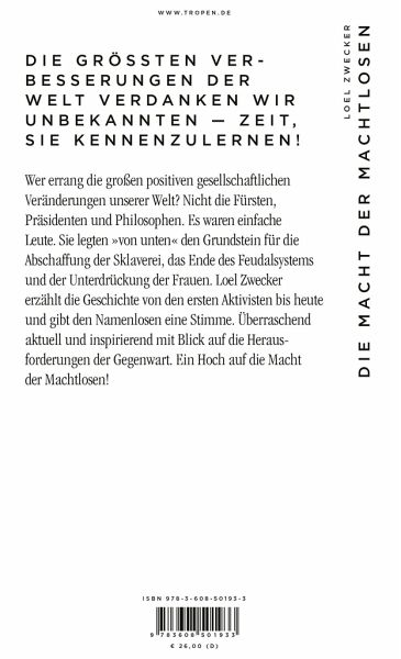 Wer errang die großen positiven gesellschaftlichen Veränderungen unserer Welt? Nicht die Fürsten, Präsidenten und Philosophen. Es waren einfache Leute. Sie legten »von unten« den Grundstein für die Abschaffung der Sklaverei, das Ende des Feudalsystems und der Unterdrückung der Frauen. Loel Zwecker erzählt die Geschichte der Namenlosen vom Mittelalter bis heute und gibt ihnen eine Stimme. Überraschend aktuell und inspirierend mit Blick auf die Herausforderungen der Gegenwart. Ein Hoch auf die Macht der Machtlosen!