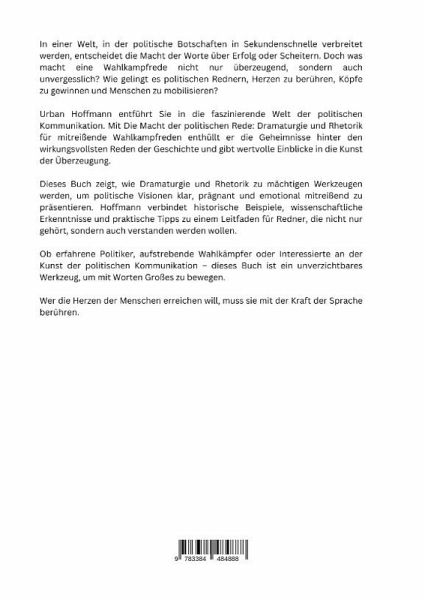 In einer Welt, in der politische Botschaften in Sekundenschnelle verbreitet werden, entscheidet die Macht der Worte über Erfolg oder Scheitern. Doch was macht eine Wahlkampfrede nicht nur überzeugend, sondern auch unvergesslich? Wie gelingt es politischen Rednern, Herzen zu berühren, Köpfe zu gewinnen und Menschen zu mobilisieren?Urban Hoffmann entführt Sie in die faszinierende Welt der politischen Kommunikation. Mit Die Macht der politischen Rede: Dramaturgie und Rhetorik für mitreißende Wahlkampfreden enthüllt er die Geheimnisse hinter den wirkungsvollsten Reden der Geschichte und gibt wertvolle Einblicke in die Kunst der Überzeugung.Dieses Buch zeigt, wie Dramaturgie und Rhetorik zu mächtigen Werkzeugen werden, um politische Visionen klar, prägnant und emotional mitreißend zu präsentieren. Hoffmann verbindet historische Beispiele, wissenschaftliche Erkenntnisse und praktische Tipps zu einem Leitfaden für Redner, die nicht nur gehört, sondern auch verstanden werden wollen.Ob erfahrene Politiker, aufstrebende Wahlkämpfer oder Interessierte an der Kunst der politischen Kommunikation - dieses Buch ist ein unverzichtbares Werkzeug, um mit Worten Großes zu bewegen.Wer die Herzen der Menschen erreichen will, muss sie mit der Kraft der Sprache berühren.