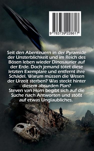 Seit den Abenteuern in der Pyramide der Unsterblichkeit und im Reich des Bösen leben wieder Dinosaurier auf der Erde. Doch jemand tötet diese letzten Exemplare und entfernt ihre Schädel. Warum müssen die Wesen der Urzeit sterben? Was steckt hinter diesem absurden Plan? Steven van Horn begibt sich auf die Suche nach Antworten und stößt auf etwas Unglaubliches.