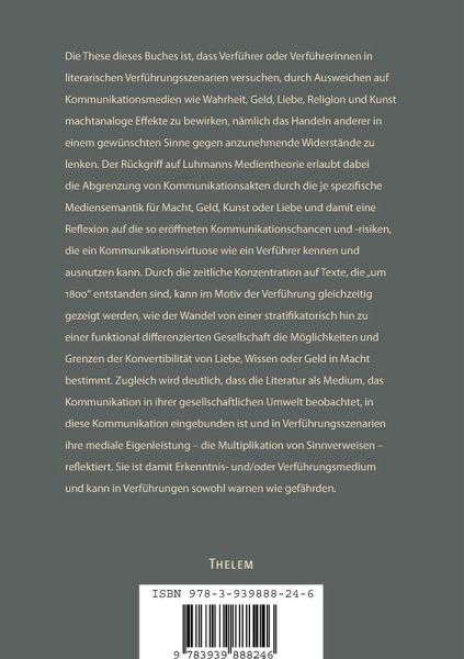 Die These dieses Buches ist, dass Verführer oder Verführerinnen in literarischen Verführungsszenarien versuchen, durch Ausweichen auf Kommunikationsmedien wie Wahrheit, Geld, Liebe, Religion und Kunst machtanaloge Effekte zu bewirken, nämlich das Handeln anderer in einem gewünschten Sinne gegen anzunehmende Widerstände zu lenken. Der Rückgriff auf Luhmanns Medientheorie erlaubt dabei die Abgrenzung von Kommunikationsakten durch die je spezifische Mediensemantik für Macht, Geld, Kunst oder Liebe und damit eine Reflexion auf die so eröffneten Kommunikationschancen und -risiken, die ein Kommunikationsvirtuose wie ein Verführer kennen und ausnutzen kann. Durch die zeitliche Konzentration auf Texte, die "um 1800" entstanden sind, kann im Motiv der Verführung gleichzeitig gezeigt werden, wie der Wandel von einer stratifikatorisch hin zu einer funktional differenzierten Gesellschaft die Möglichkeiten und Grenzen der Konvertibilität von Liebe, Wissen oder Geld in Macht bestimmt. Zugleichwird deutlich, dass die Literatur als Medium, das Kommunikation in ihrer gesellschaftlichen Umwelt beobachtet, in diese Kommunikation eingebunden ist und in Verführungsszenarien ihre mediale Eigenleistung - die Multiplikation von Sinnverweisen - reflektiert. Sie ist damit Erkenntnis- und/oder Verführungsmedium und kann in Verführungen sowohl warnen wie gefährden.