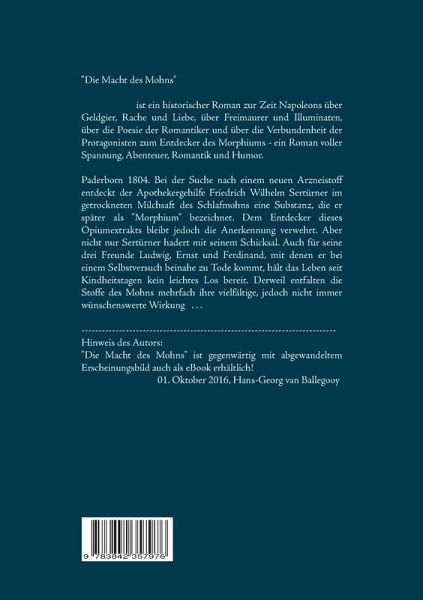 "Die Macht des Mohns" ist ein historischer Roman zur Zeit Napoleons über Geldgier, Rache und Liebe, über Freimaurer und Illuminaten, über die Poesie der Romantiker und über die Verbundenheit der Protagonisten zum Entdecker des Morphiums - ein Roman voller Spannung, Abenteuer, Romantik und Humor.Paderborn 1804. Bei der Suche nach einem neuen Arzneistoff entdeckt der Apothekergehilfe Friedr. Wilh. Sertürner im getrockneten Milchsaft des Schlafmohns eine Substanz, der er eine außerordentliche Bedeutung beimisst. Dem Entdecker dieses später als Morphin bezeichneten Opiumextrakts bleibt jedoch die Anerkennung durch die medizinisch-pharmazeutischen Fachkreise verwehrt.Derweil hadert nicht nur Sertürner mit seinem Schicksal. Auch für seine drei Freunde, mit denen er bei einem Selbstversuch beinahe zu Tode kommt, hält das Leben seit Kindheitstagen kein leichtes Los bereit:Das Findelkind Ludwig wird wegen eines Erbes entführt. Der von seinen Eltern getrennt lebende Ferdinand sucht bei derBewältigung seiner traumatischen Erlebnisse in der Ehe mit Agnes Halt. Die Verlobung des beim Paderborner Hofbuchdrucker ausgebildeten Ernst mit Agnes' Zwillingsschwester Elsbeth zerbricht an den Emanzipationsbestrebungen der Braut, nachdem beide in Berlin die in den literarischen Salons gepflegte Poesie der Romantiker kennengelernt haben.Die Macht des Mohns erleben die Freunde bei dramatischen Ereignissen mit tragischem Ausgang, als sie Ludwigs Adoptiveltern bis ins Frankenland verfolgen, weil diese als Mitglieder des Illuminatenordens an dem Verschwinden der Aachener Kleinodien aus dem Paderborner Kapuzinerkloster beteiligt zu sein scheinen.In Hameln geraten die Freunde an einen rachsüchtigen Magistratssohn sowie an einen zwielichtigen Oberst. Dieser ist Befehlshaber in der zunehmend verhassten napoleonischen Grande Armée, die erst bei Waterloo entscheidend geschlagen werden kann. Auch dort entfalten die Stoffe des Mohns einmal mehr ihre vielfältige, jedoch nicht immer wünschenswerte Wirkung.