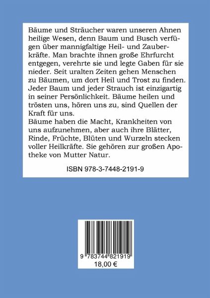 Spätestens seit dem Erscheinen des Buches von Peter Wohlleben ist das Thema "Bäume" aktueller denn je. Bäume und Sträucher waren unseren Ahnen heilige Wesen, denn Baum und Busch verfügen über mannigfaltige Heil- und Zauberkräfte. Man brachte ihnen große Ehrfurcht entgegen, verehrte sie und legte Gaben für sie nieder. Seit uralten Zeiten gehen Menschen zu Bäumen, um dort Heil und Trost zu finden. Jeder Baum und jeder Strauch ist einzigartig in seiner Persönlichkeit. Bäume heilen und trösten uns, hören uns zu, sind Quellen der Kraft für uns. Bäume haben die Macht, Krankheiten von uns aufzunehmen; aber auch ihre Blätter, Rinde, Früchte, Blüten und Wurzeln stecken voller Heilkräfte. Sie gehören zur großen Apotheke von Mutter Natur.