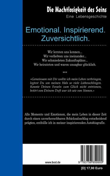 Wir lernten uns kennen...Wir verliebten uns ineinander...Wir schmiedeten Zukunftspläne...Wir heirateten und waren unsagbar glücklich.»Gemeinsam mit Dir wollte ich mein Leben verbringen,legtest Du um meinen Hals so viele Liebesschlingen.Konnte Deinen Fesseln zum Glück nicht entrinnen,betört von Deinem Duft war ich wie von Sinnen.«Alle Momente und Emotionen, die mein Leben in dieser Zeitdurch einen unvorhersehbaren Schicksalsschlag meiner Frau entscheidend prägten, enthülle ich in meiner inspirierenden Autobiografie.