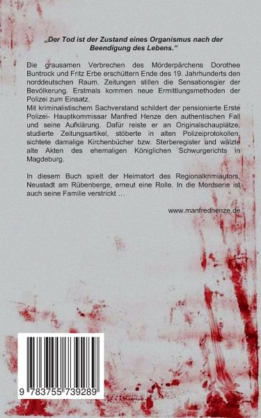 "Der Tod ist der Zustand eines Organismus nach der Beendigung des Lebens."Die grausamen Verbrechen des Mörderpärchens Dorothee Buntrock und Fritz Erbe erschüttern Ende des 19. Jahrhunderts den norddeutschen Raum. Zeitungen stillen die Sensationsgier der Bevölkerung. Erstmals kommen neue Ermittlungsmethoden der Polizei zum Einsatz.Mit kriminalistischem Sachverstand schildert der pensionierte Erste Polizei-Hauptkommissar Manfred Henze den authentischen Fall und seine Aufklärung. Dafür reiste er an Originalschauplätze, studierte Zeitungsartikel, stöberte in alten Polizeiprotokollen, sichtete damalige Kirchenbücher bzw. Sterberegister und wälzte alte Akten des ehemaligen Königlichen Schwurgerichts in Magdeburg. In diesem Buch spielt der Heimatort des Regionalkrimiautors, Neustadt am Rübenberge, erneut eine Rolle. In die Mordserie ist auch seine Familie verstrickt